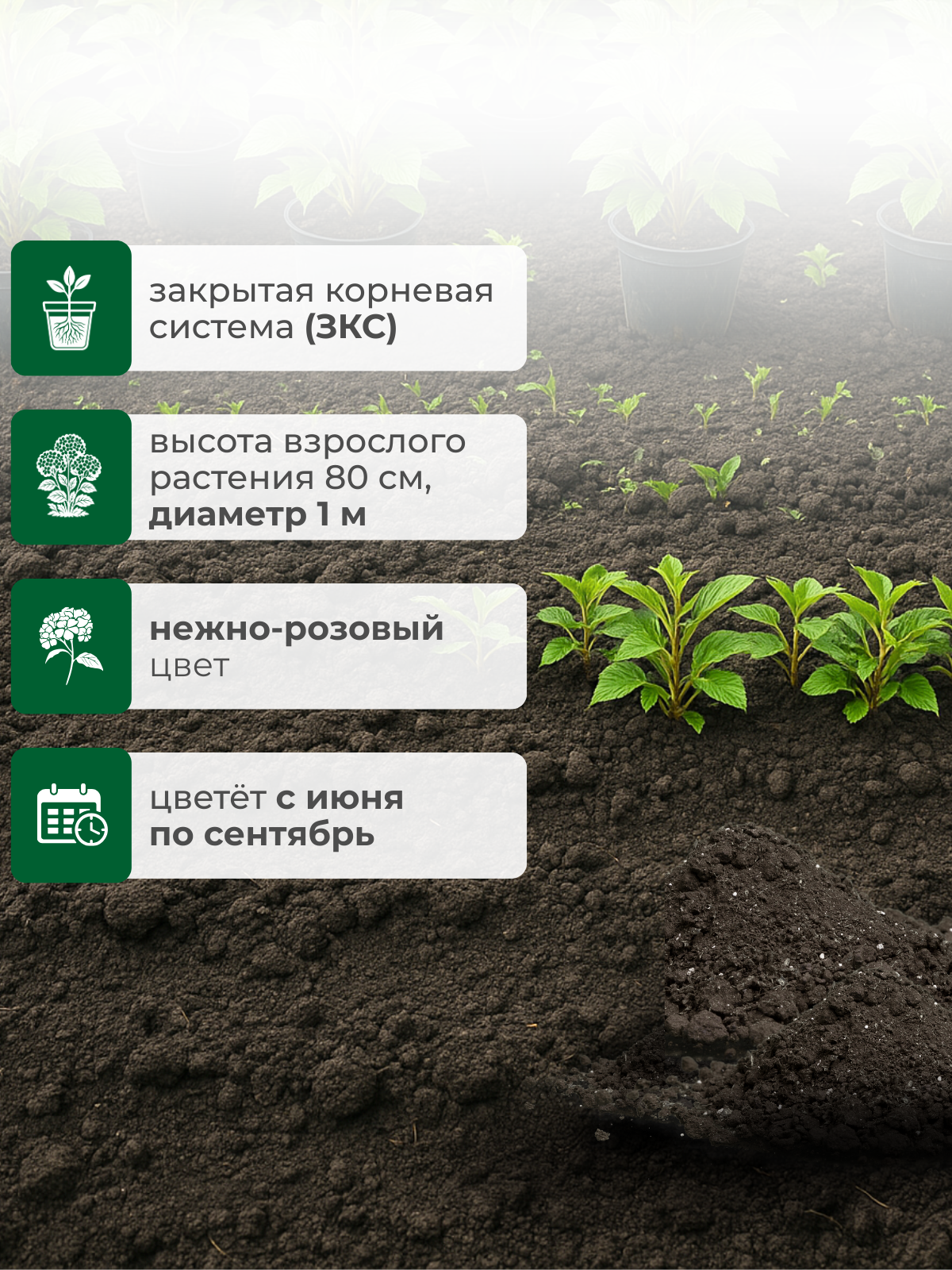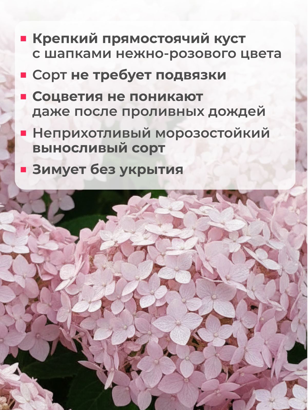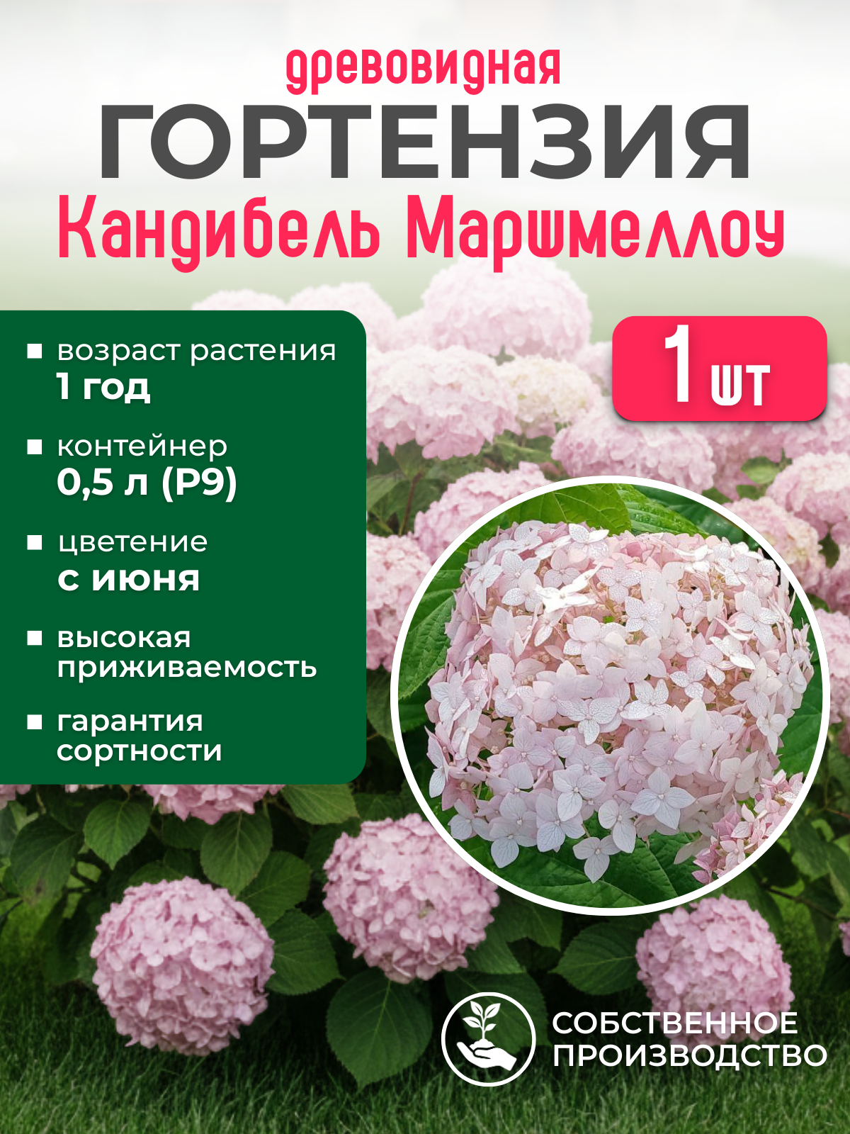 Гортензия древовидная Кандибелле Маршмеллоу - низкорослая и компактная гортензия – это 80 см высоты и метр в диаметре, полусферическая крона. У сорта плотные и упругие, очень крепкие побеги. Форма листьев приближена к сердцевидной, у листа мелкозубчатый край и насыщенно-зеленый окрас. Куст отлично держит форму, не разваливается. Растение относится к красивоцветущим. Впечатляют и его крупные соцветия, диаметр которых может доходить до 35 см. Цветки распускаются зеленовато-белыми, а потом приобретают нежно-розовый окрас. Цвет меняется в процессе вегетации. Сами цветки в диаметре до 2 см. Аромат у сорта легкий, мягкий, ненавязчивый. Цветет на побегах текущего года. Зимостойкость высокая, цветет ежегодно.