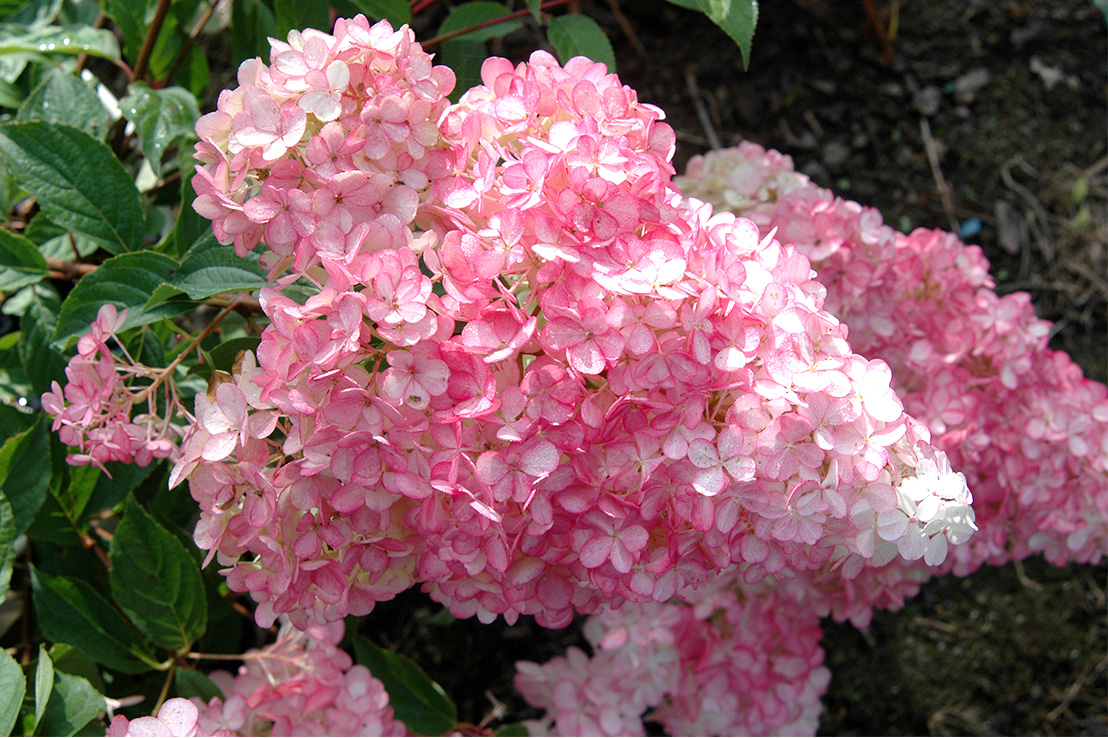 Гортензия метельчатая Строуберри Блоссом (Hydrangea paniculata Strawberry Blossom) - компактный куст, высотой до 1 м. Цветет начиная с июля и до октября. Зацветает уже в год посадки. Крупные стерильные белые с кремовым оттенком кремовые цветы в начале роспуска постепено розовеют и в конце фееричного цветения в конце сезона приобретают розово малиновый оттенок сохраняя верхушку цвета слоновой кости. Цветение обильное. Куст хорошо разветвлённый с очень сильными ветвями.