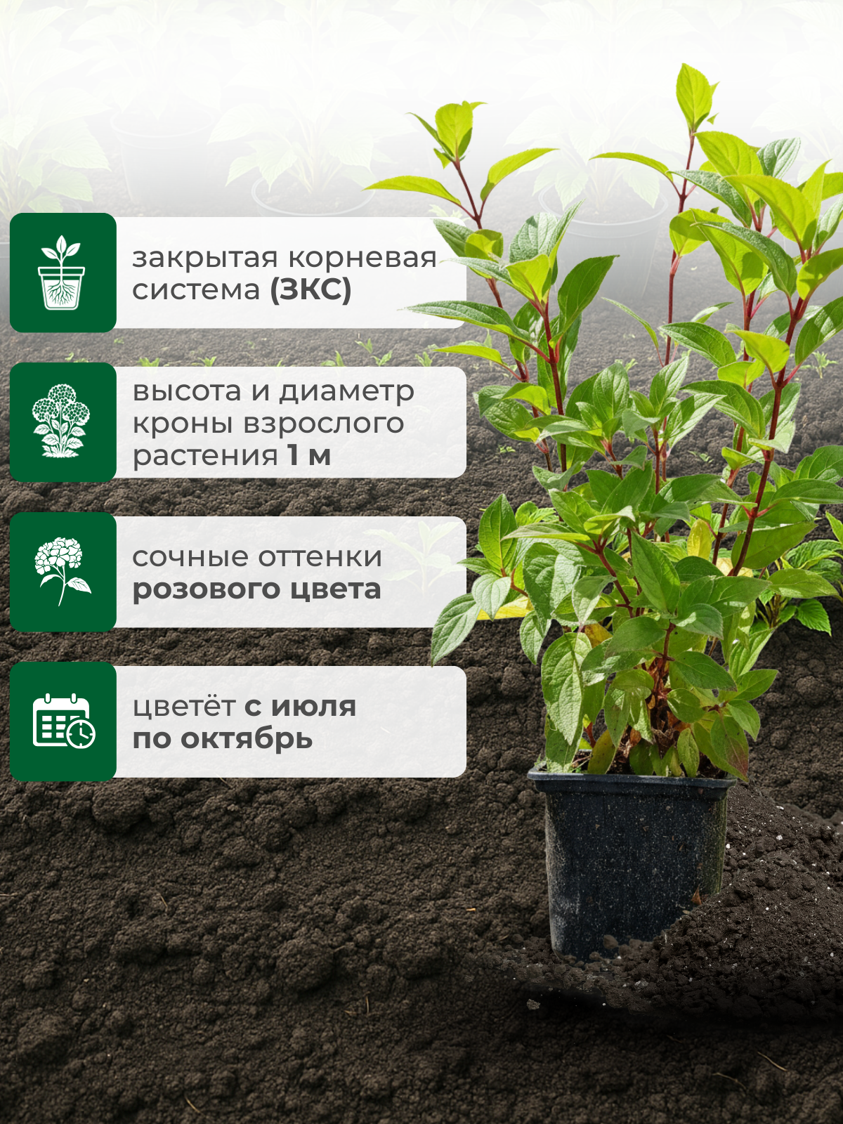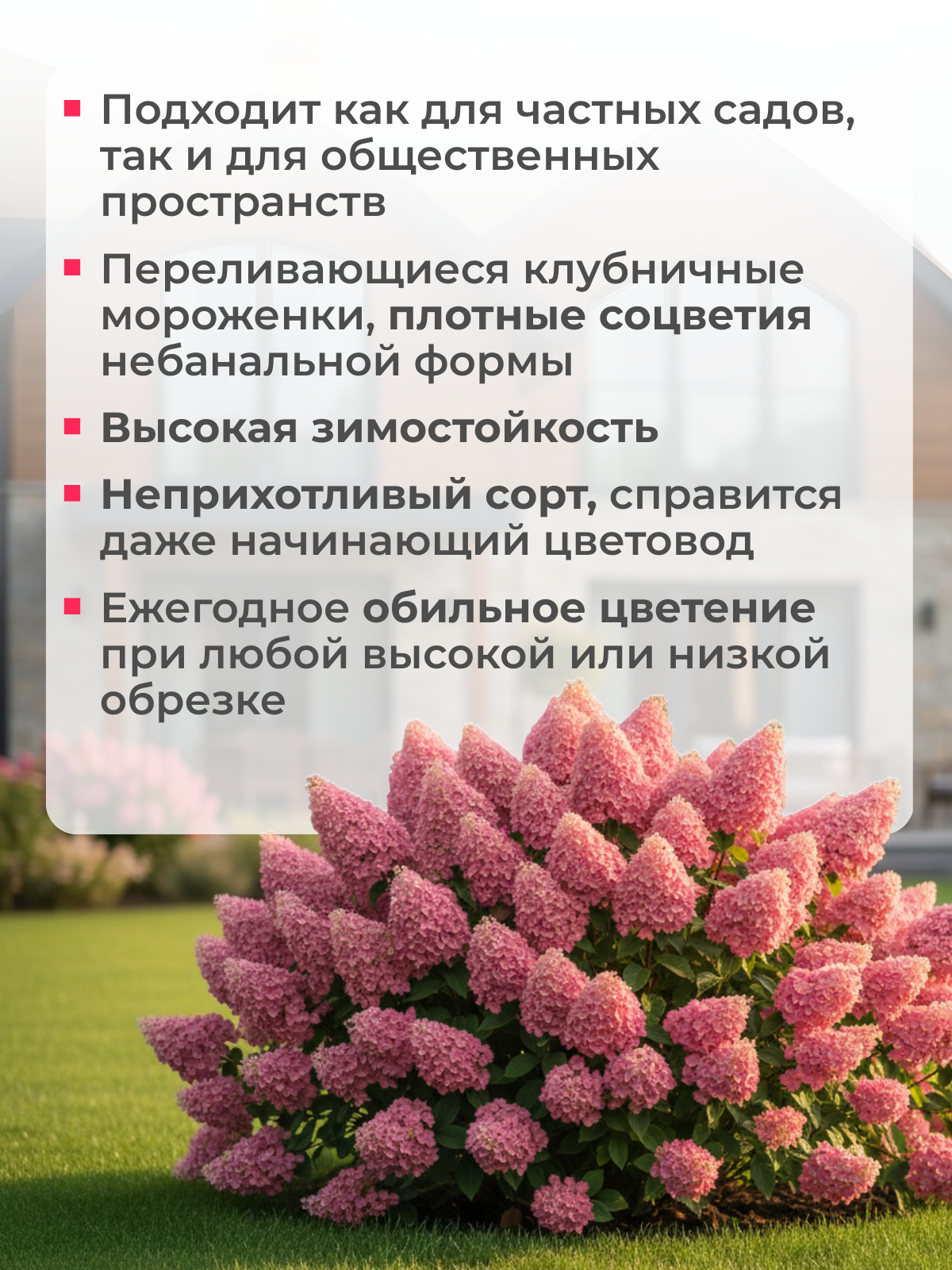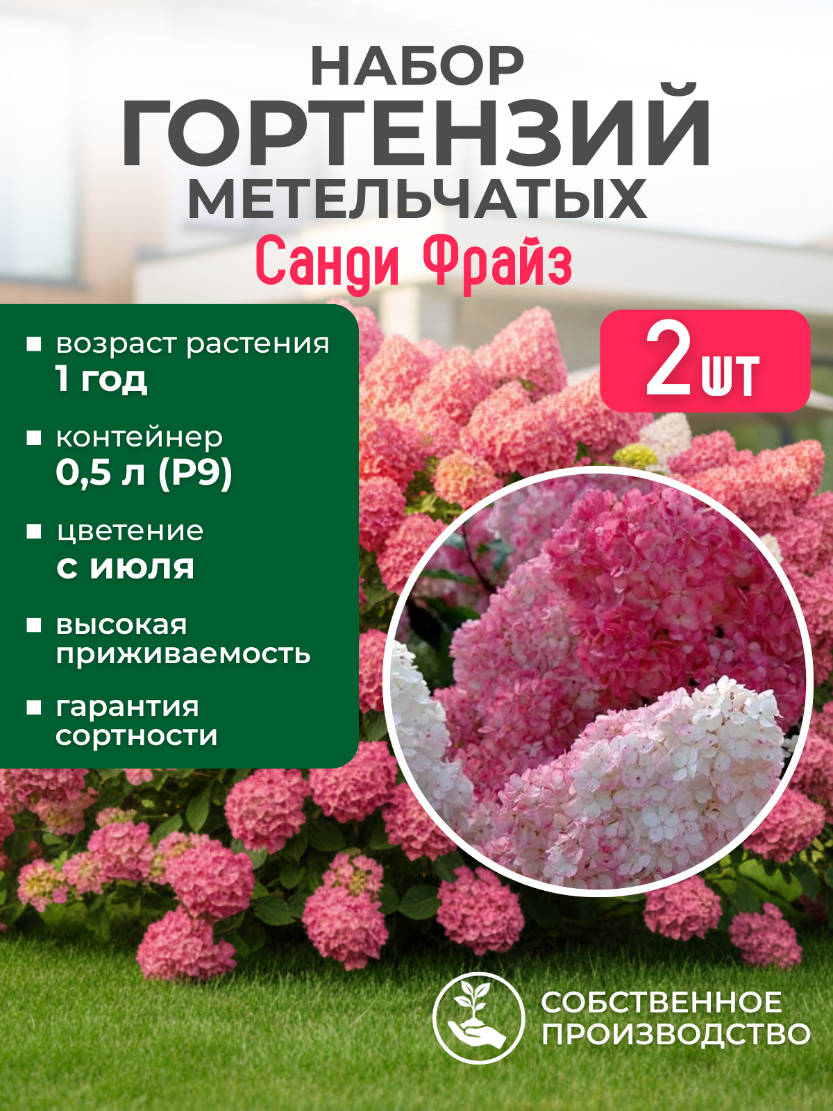 Гортензия метельчатая Санди Фрайз относится к компактному сорту метельчатой гортензии. Высота куста составляет – 1м. Сорт отличается пышным соцветием. Имеет нежное и красивое сочетание различных тонов во время цветения. Цвет – яркий, насыщенный розовый (напоминает светло малиновый, сиреневый) во 2-ой фазе цветения. Повышенная устойчивость к морозу. Куст цветет с середины июля по сентябрь включительно. Начинает цвести уже в первом году после посадки.